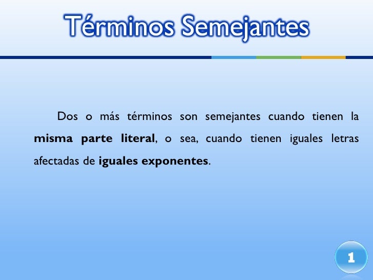 - 2. <ul><li>Dos o más términos son semejantes cuando tienen la misma parte literal , o sea, cuando tienen iguales letras afectadas de iguales exponentes . </li></ul>