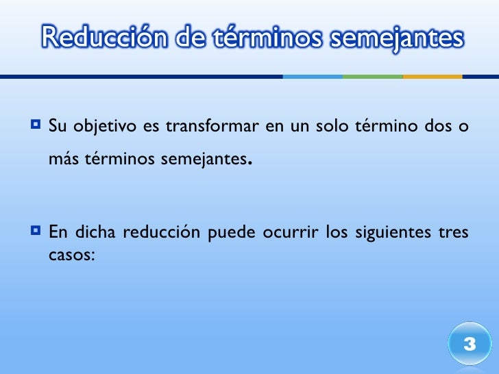 - 4. <ul><li>Su objetivo es transformar en un solo término dos o más términos semejantes . </li></ul><ul><li>En dicha reducción puede ocurrir los siguientes tres casos: </li></ul>